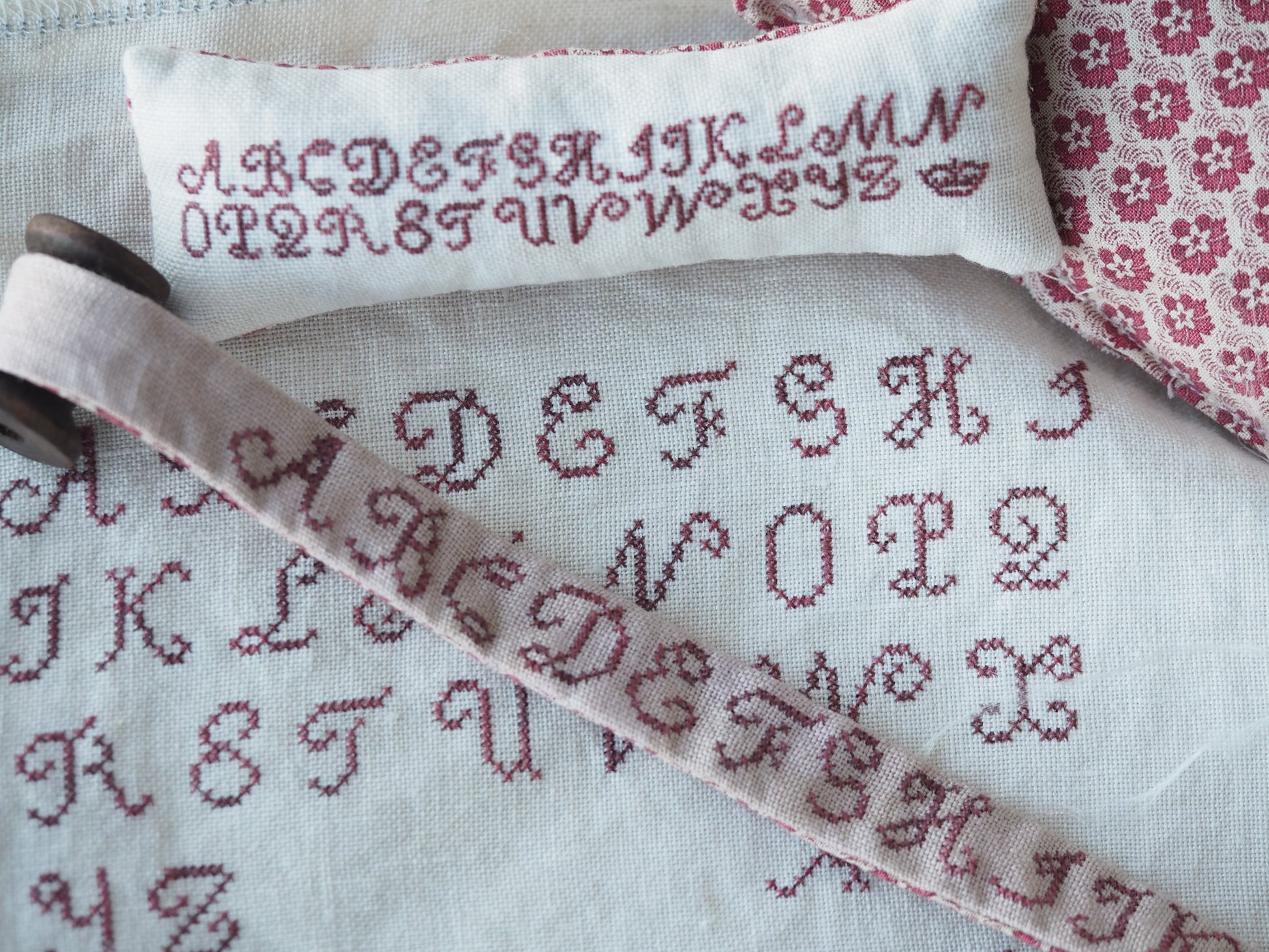 The main sampler and pin cushion are stitched on 36ct Fiber on a Whim Cream and Sugar however the pattern does give you details of fabric measurements if you wish to stitch it on a different linen/aida. The bobbin scroll is stitched on FIber on a Whim Cafe au Lait.