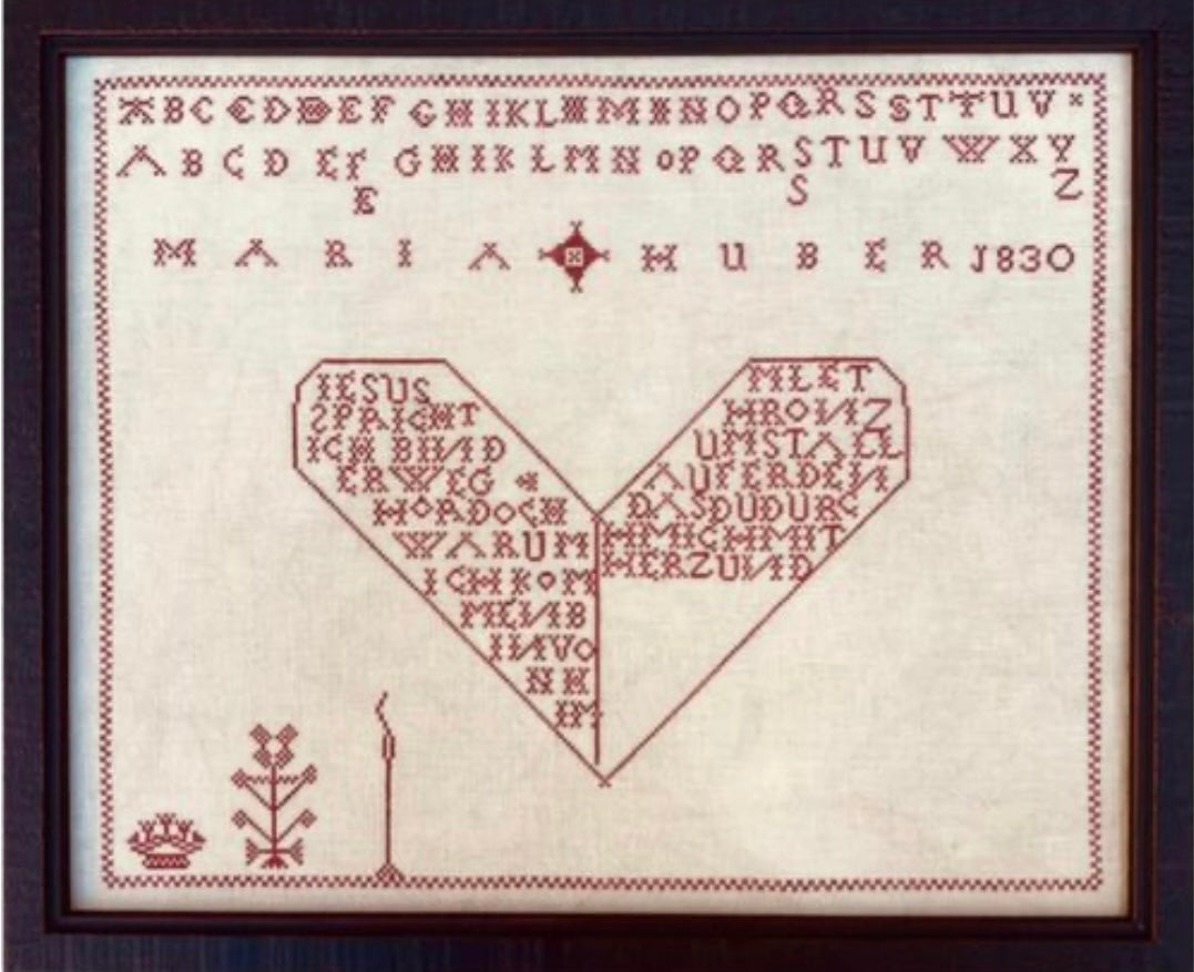 Cross stitch pattern from Cardan Antiques & Needlework featuring a lovely heart sampler.