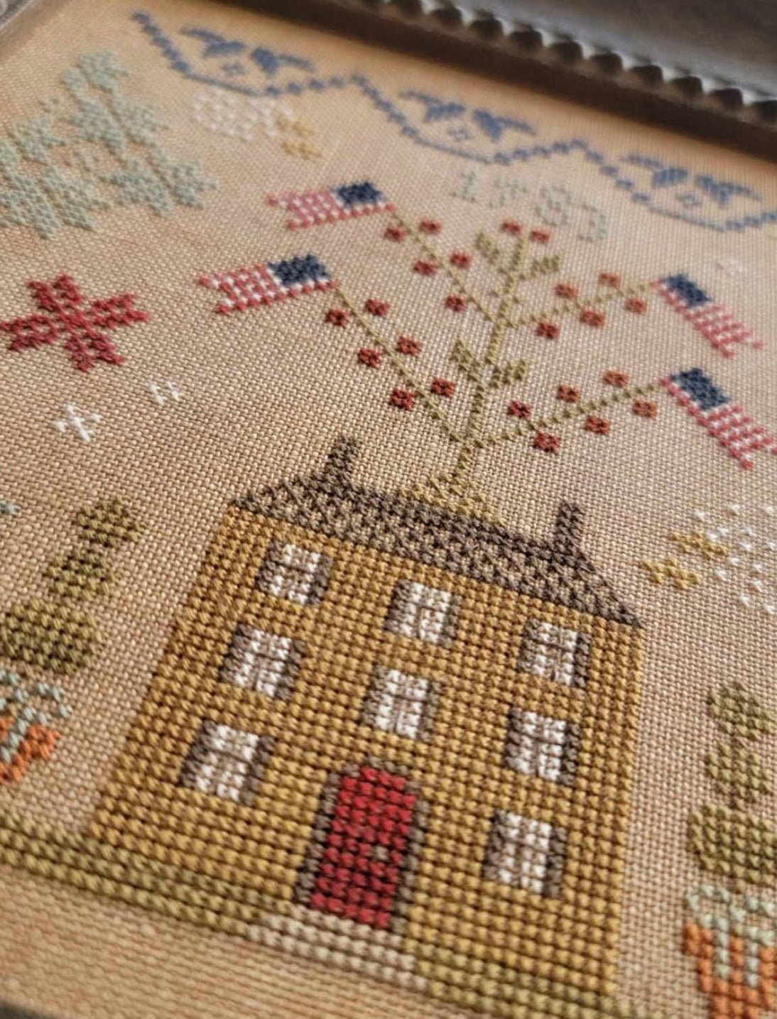 This is a sampler with a patriotic flair centered around the famous quote written in a letter by Benjamin Franklin in 1783. Just a year earlier, the Bald Eagle became the national bird of the United States when it was placed with outspread wings on the Great Seal of our nation. The eagle is the most pictured bird in all of America. The eagle with the flag in its beak is the central focal motif of this piece and would also make an excellent small pincushion or needlebook on its own.