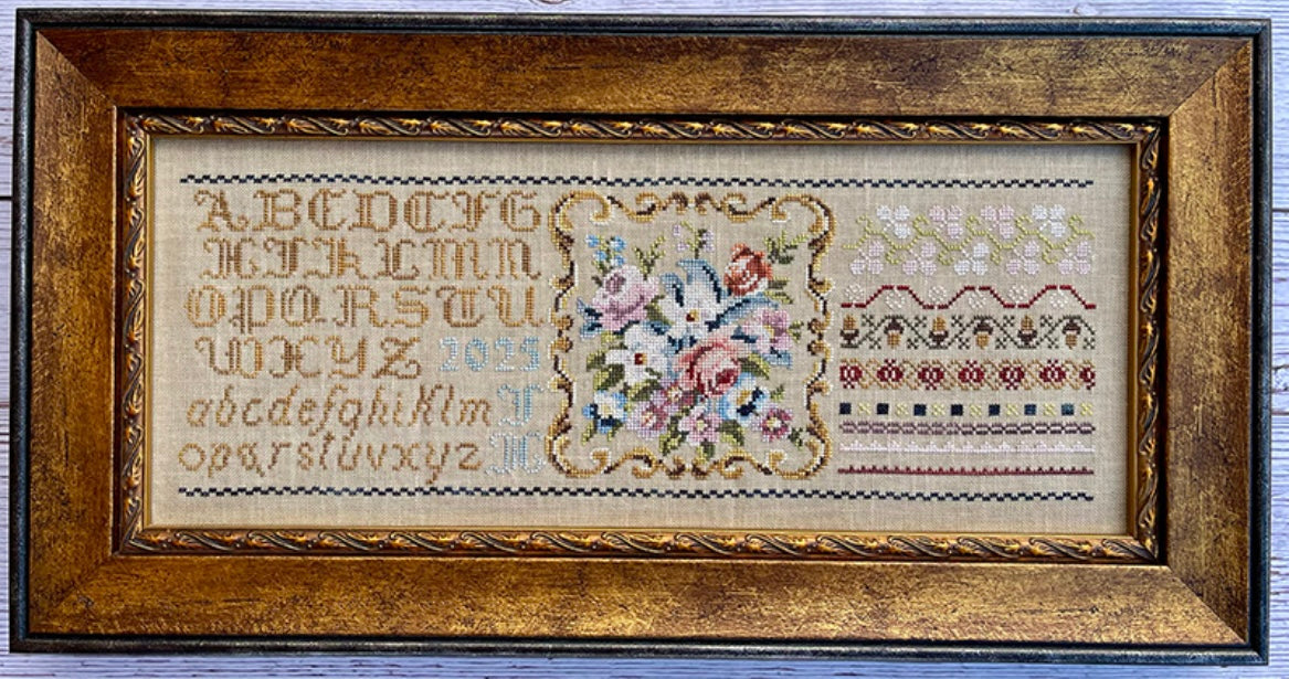 Absolutely stunning sampler from Jan Hicks Creates. We fell in love with this when we saw it. The centre posy is a reproduction of a powder compact and a pattern we are so excited to be bringing back from Nashville.