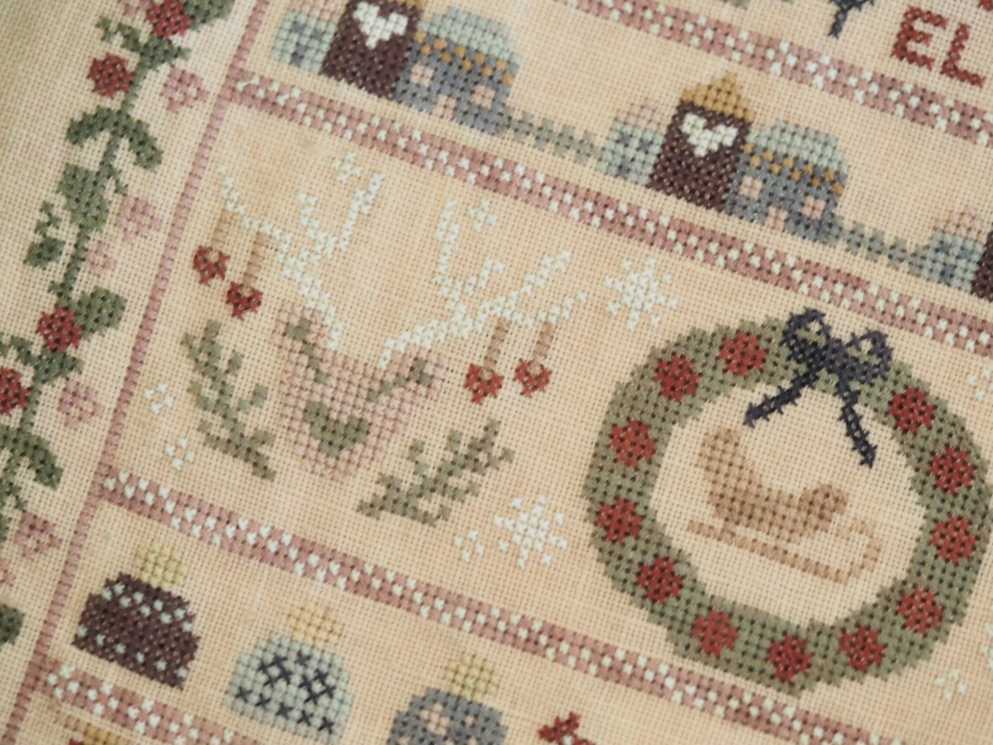 A christmas sampler full of mini motifs inspired by Noridc/Scandi winter. Stitch little fairisle jumpers, scandi houses, christmas baubles, woolly hats and more. You can stitch the full sampler as we have done or you could just stitch some of the mini motifs and make into stitching accessories (think scissor fobs, a pin cushion of jumpers, christmas bunting)