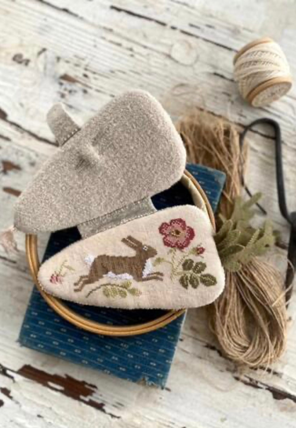 Cross stitch pattern from Stacy Nash Primitives featuring a cute little bunny on a parsnip shaped needle book.